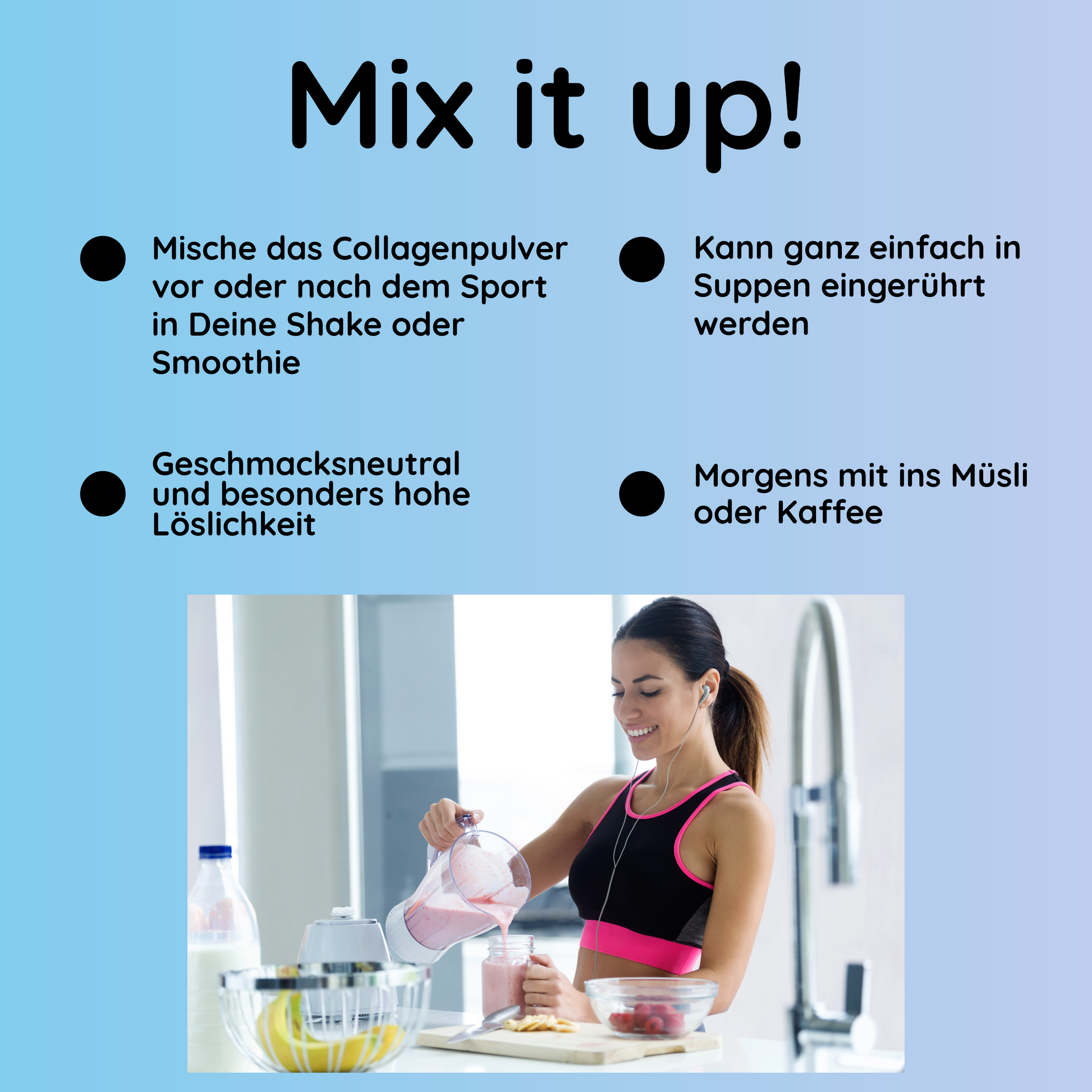 Unser Collagen Pulver ist geschmacksneutral und ohne Zucker oder Süßungsmittel. Es eignet sich perfekt zum Einrühren in Shakes, Smoothies, Saft und löst sich sofort ohne zu verklumpen auf. Es eignet sich ebenfalls hervorragend für Heißgetränke wie Kaffee und Kakao und kann auch problemlos ins Suppen eingerührt werden. Es ist hitzebeständig und kann auch zum Backen und Kochen verwendet werden.